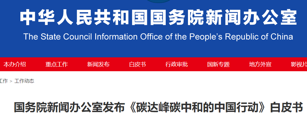 国务院新闻办公室发布《碳达峰碳中和的中国行动》白皮书